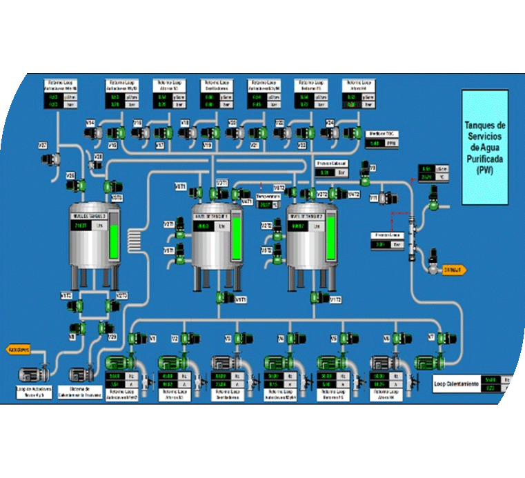 • Agua Purificada (PW): monitoreo de flujo, calidad (conductividad, temperatura) y presión.