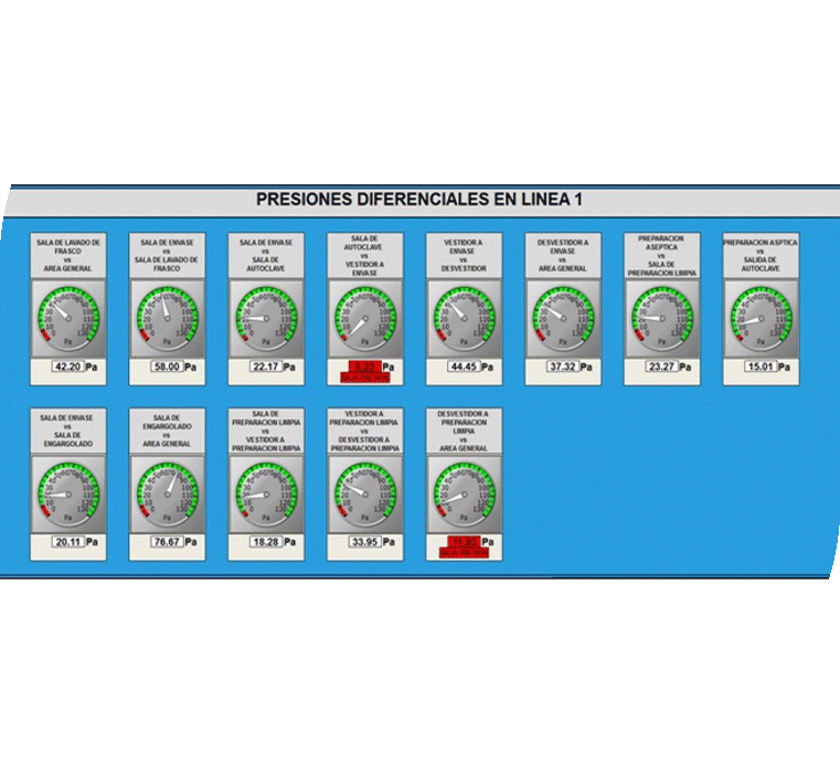 • Condiciones ambientales en Áreas Limpias: temperatura, humedad relativa, presión diferencial, partículas y otros parámetros críticos.